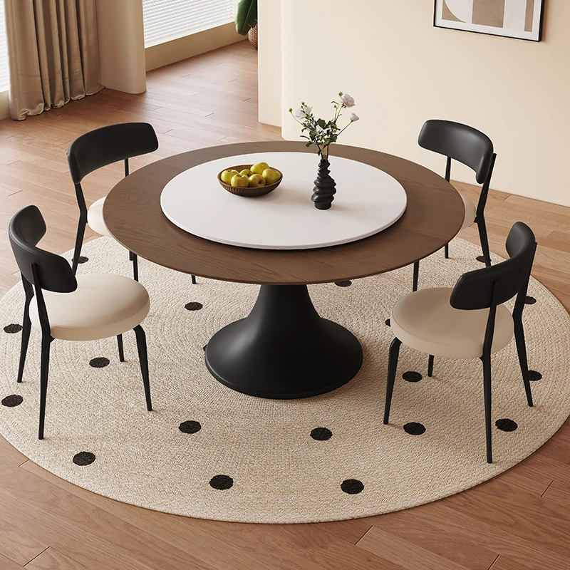 Vintage French-Style Round Dining Table with Turntable - Premium Solid Wood and Rock Slab Design for Elegant Dining in Dining Rooms and Living Rooms