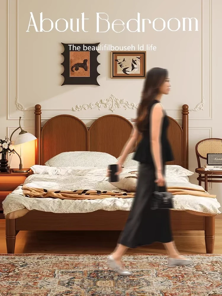 2024年新作!レトロスタイルの無垢材ベッド✨モダンな主寝室・サブ寝室にぴったり!1.5m・1.8mサイズのアンティーク風彫刻入りダブルベッド。おしゃれで快適な寝空間を演出します!