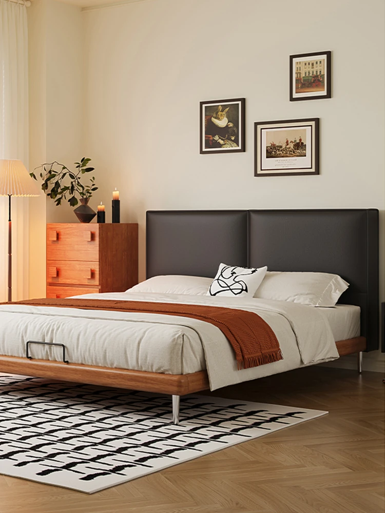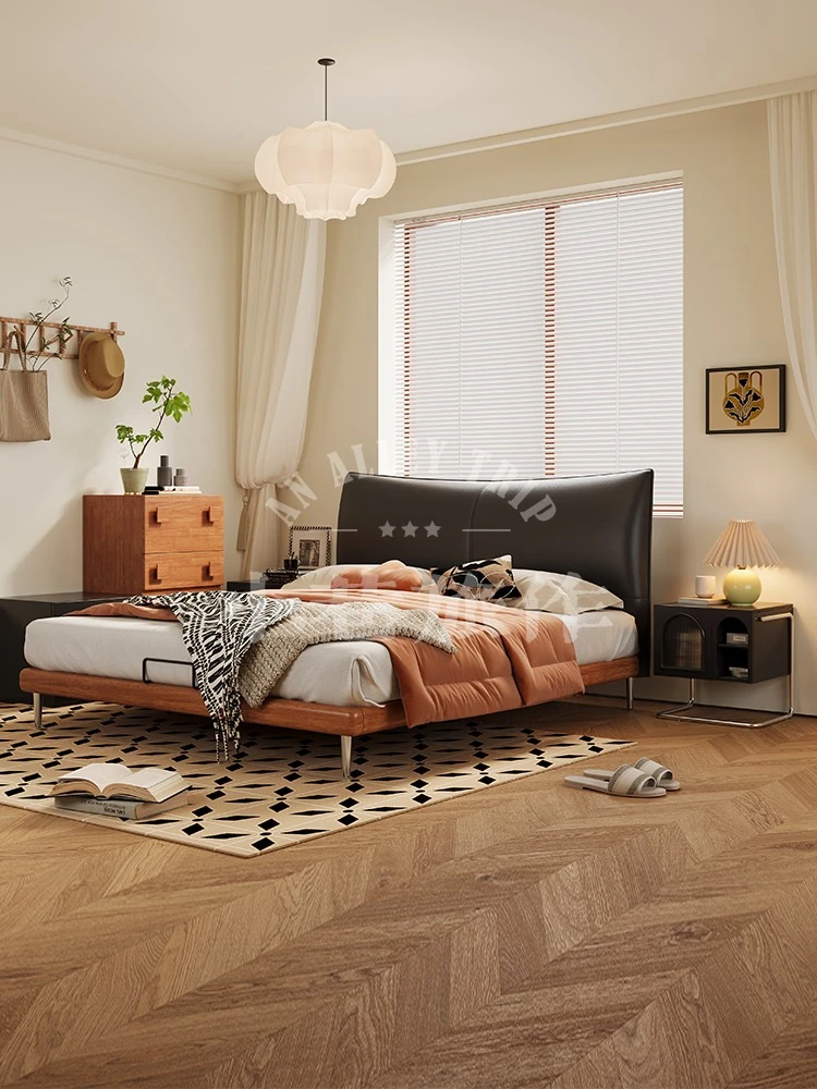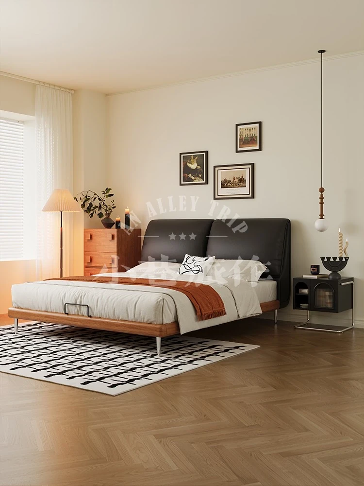 中古風ソフトパックレザー背もたれ付きモダンシンプルレトロスタイルの主寝室・サブ寝室用無垢材ダブルベッド。高級感溢れるデザインで、快適な睡眠をお約束します!