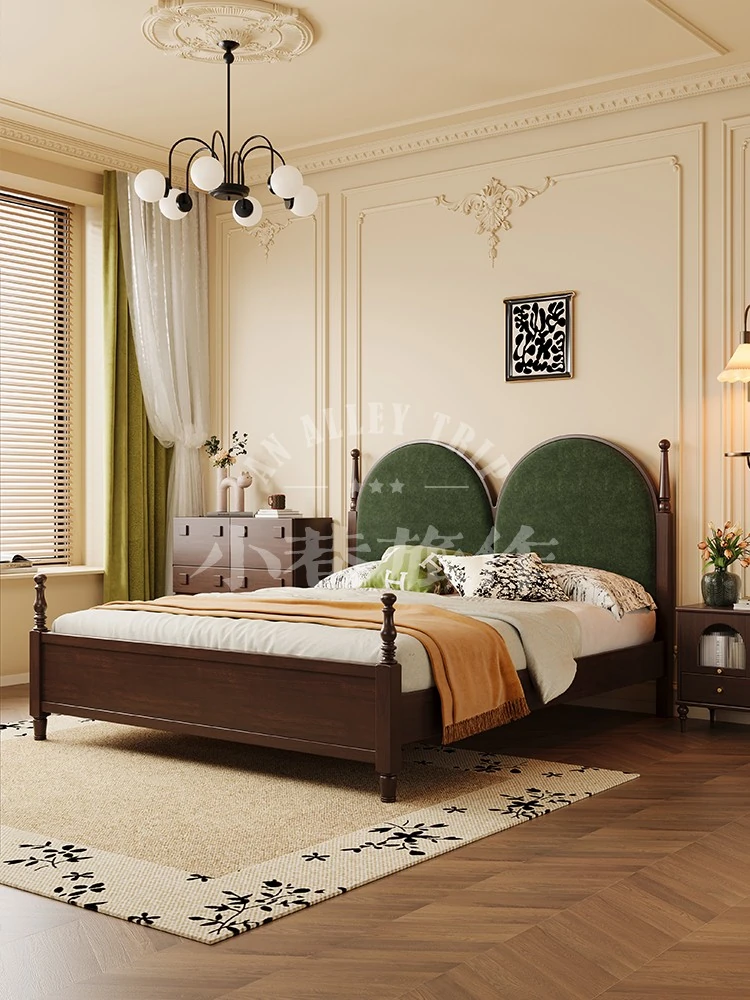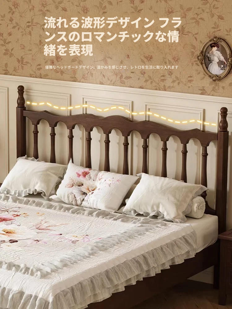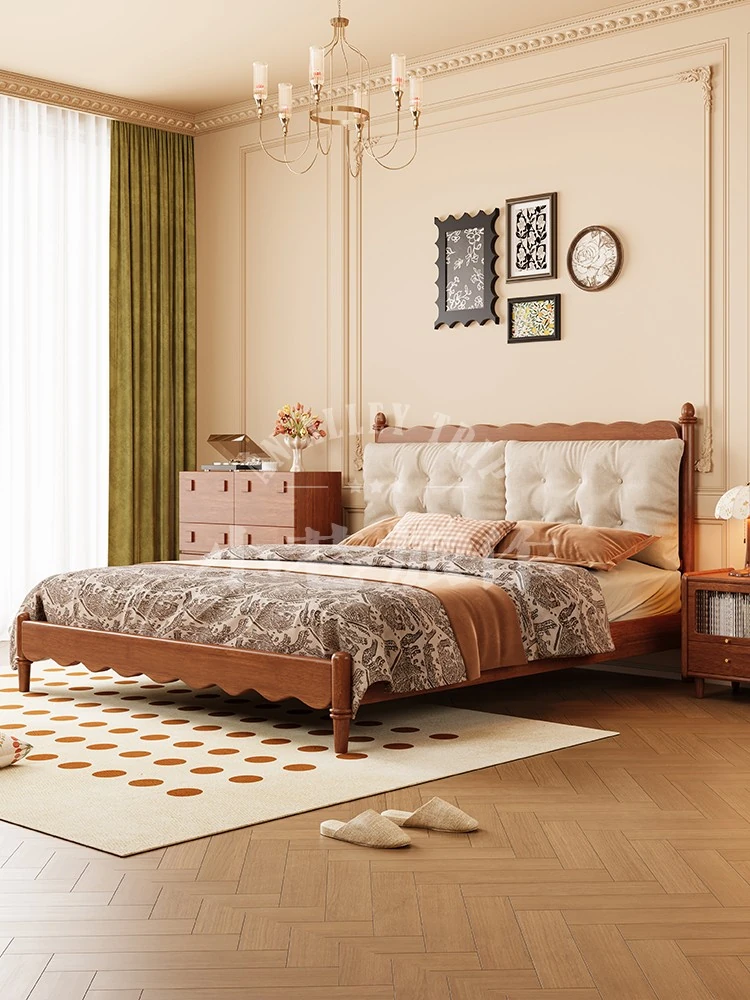 フレンチヴィンテージスタイルのソフトバック実木ベッド - 中古風デザインの主寝室・副寝室用、1.5m・1.8m対応、デザイナーの波形ダブルベッドで、優雅な睡眠空間を演出!