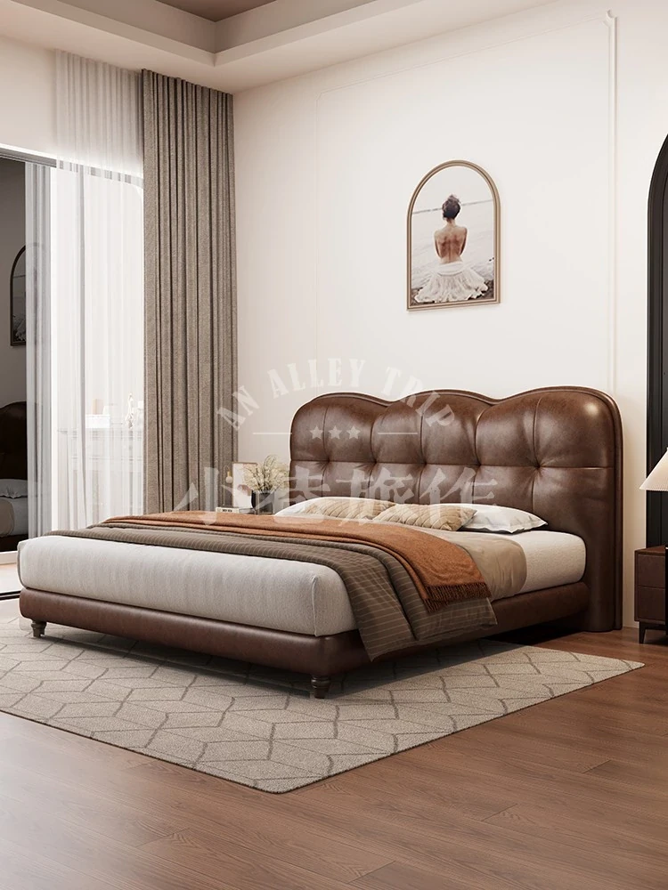 小道の旅 中古風パリスタイル ブラウンレザーの軽奢真皮ベッド 1.8m&1.5m ダブルベッド 主寝室用 大人の格調高い空間を演出!