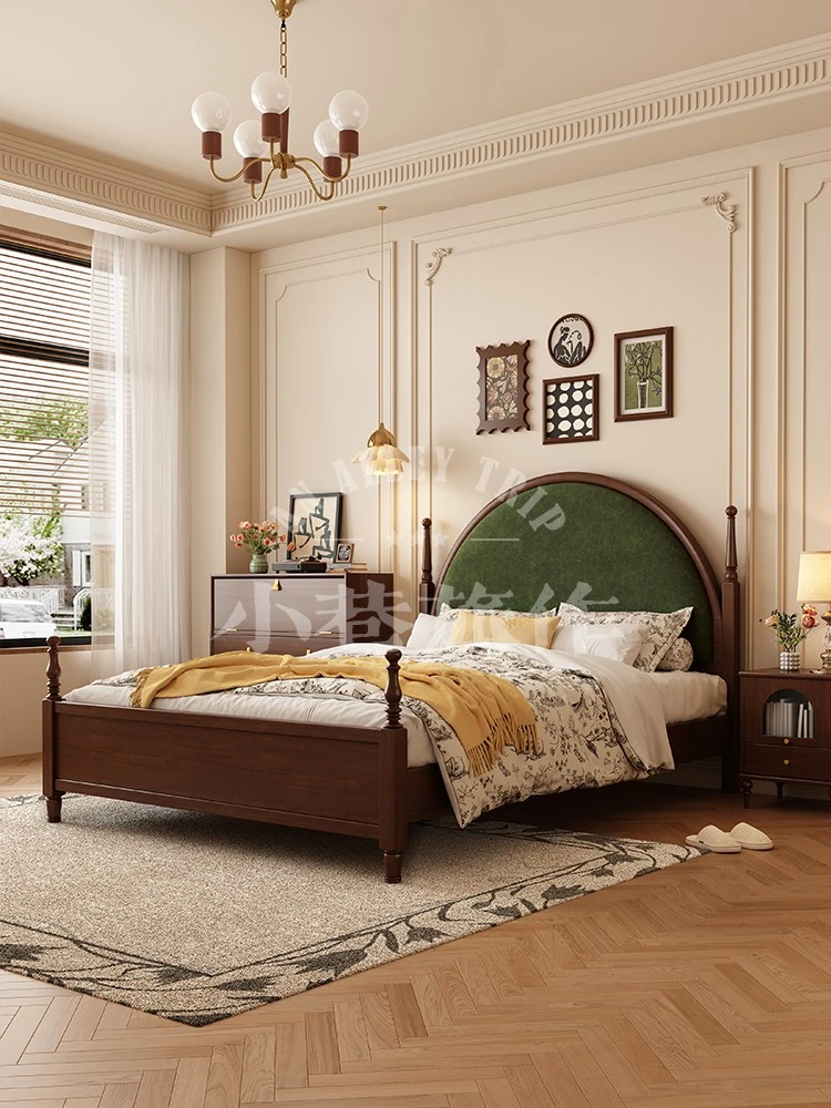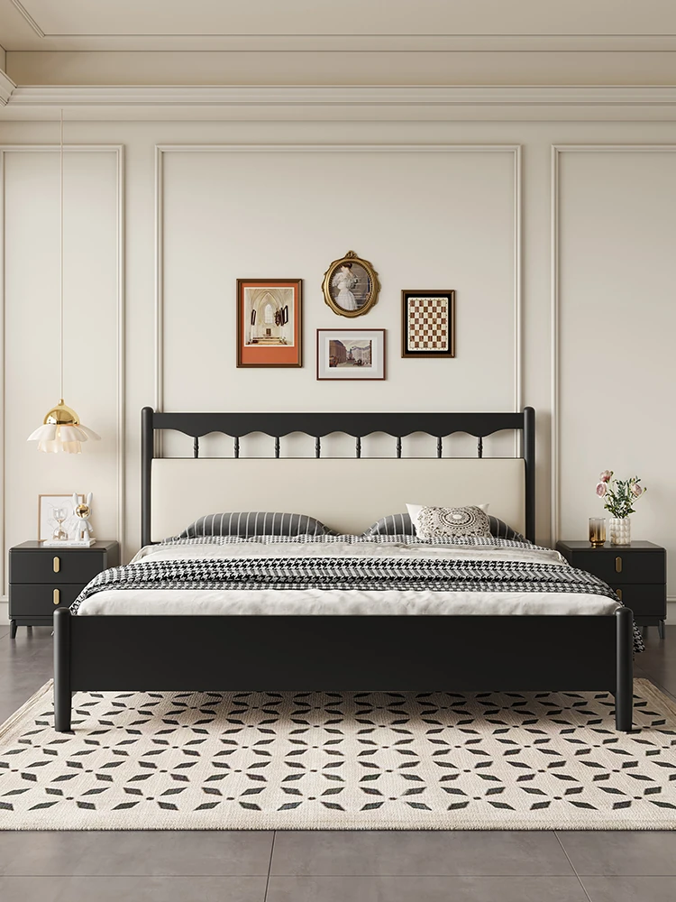 フレンチクリーム風のヴィンテージブラック無垢材ベッド - モダンシンプルなアメリカンスタイル、1.5m & 1.8m ダブルベッド、主寝室にぴったりな上質なデザインで、心地よい眠りをお届けします!