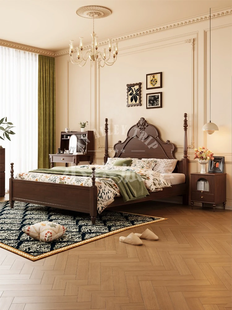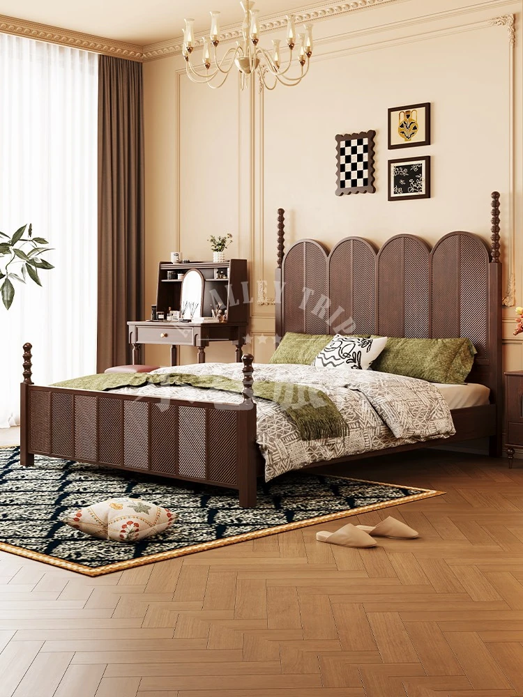 アメリカンレトロスタイルの無垢材ダブルベッド|現代的なラグジュアリー感漂う主寝室・副寝室用|1.5m・1.8m対応|ヴィンテージ感あふれるローマ柱デザインで、上質な眠りを実現!