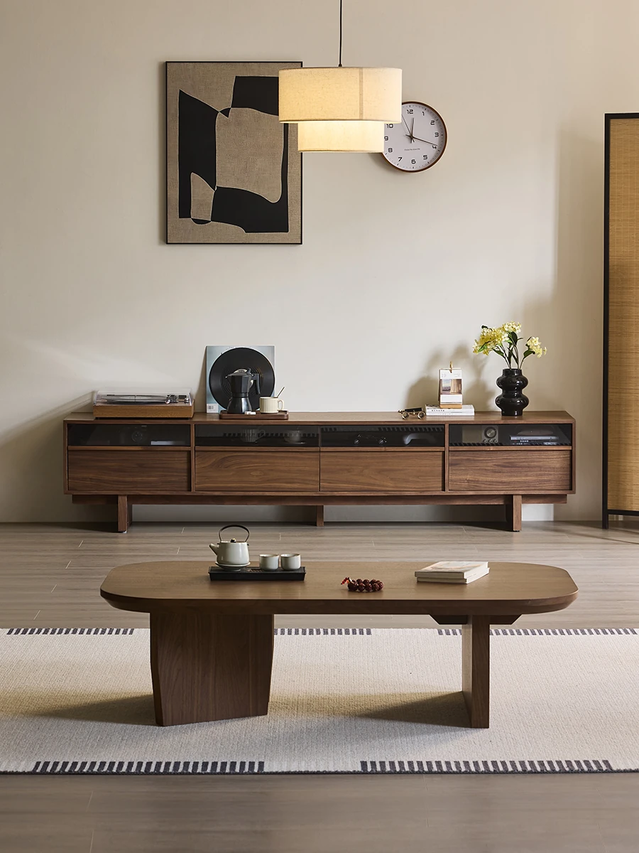 小道の旅 - レトロスタイルの無垢材製コーヒーテーブル&テレビ台、ウォールナットカラーのヴィンテージデザイン、小型リビングにぴったりの収納付き!