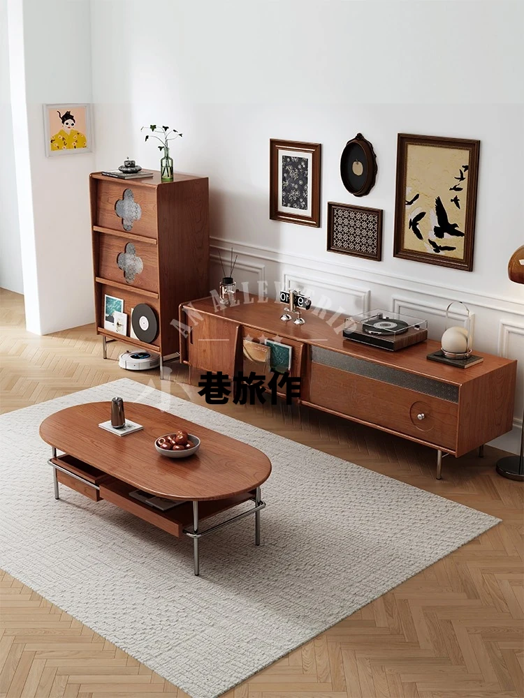 中古の無垢チークテレビキャビネット フランススタイルの高めのデザイン 宋式美学を取り入れた小型リビング向け シネマティックな雰囲気を演出するコンビネーションキャビネット