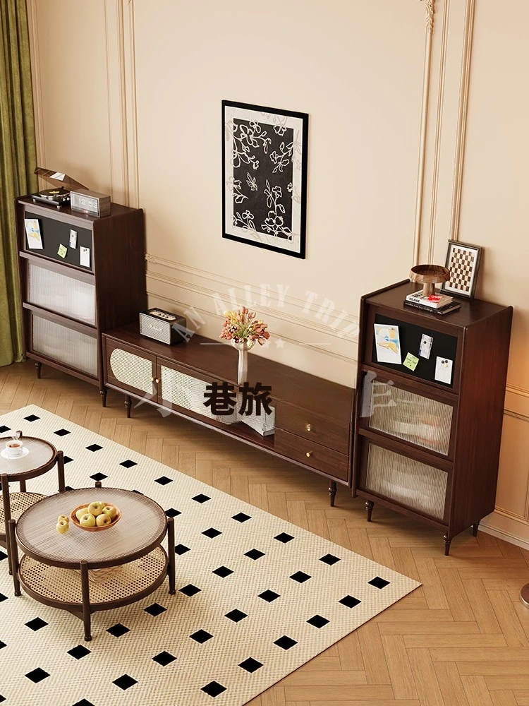 小道の旅 | レトロ風のラタン編みテレビキャビネットとコーヒーテーブルのセット - 和風の家庭用リビング収納キャビネット、新デザインでおしゃれな空間を演出!