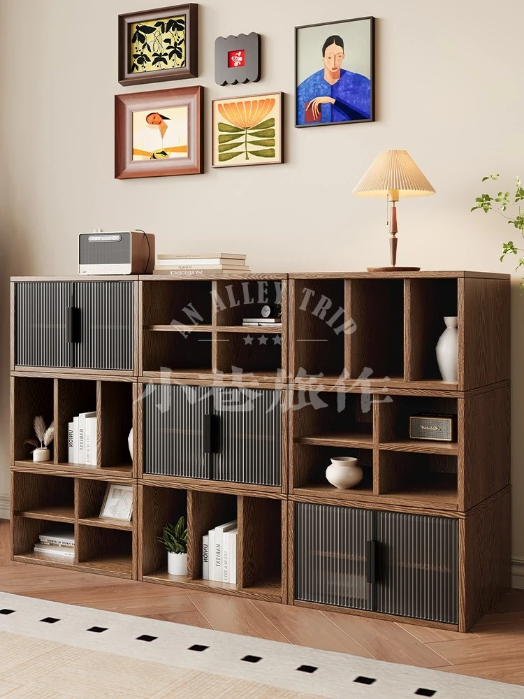 レトロスタイルの自由組み合わせ可能な無垢材キャビネット!アンティーク風の小型リビングにぴったりなフロア型書棚、収納力抜群でお部屋をスッキリ整理。おしゃれなインテリアで、心地よい空間を演出します!