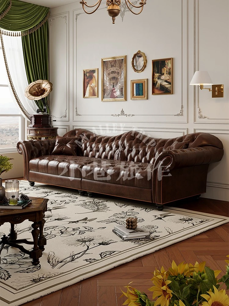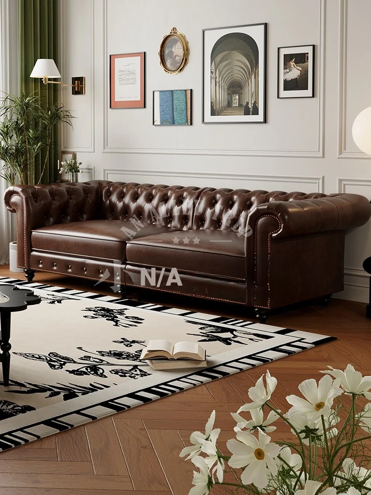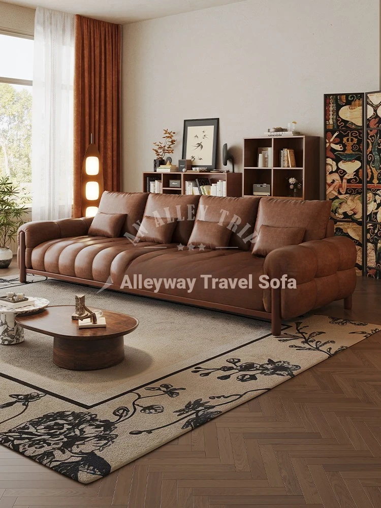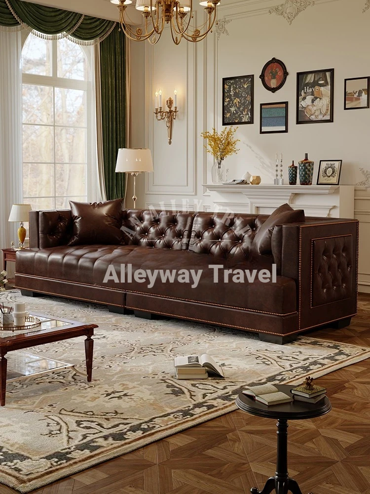 Alley Travel | Vintage American Oil Wax Leather Sofa - European Style Button Tufted Brown Straight Sofa for a Cozy Living Room