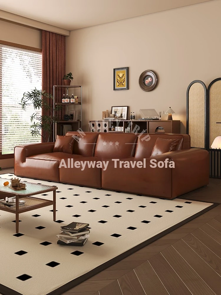 Alley Travel | Vintage American Style Waxed Leather Sofa - Brown Leatherette Living Room Sofa with Straight Pull Buckles for Villa Decor