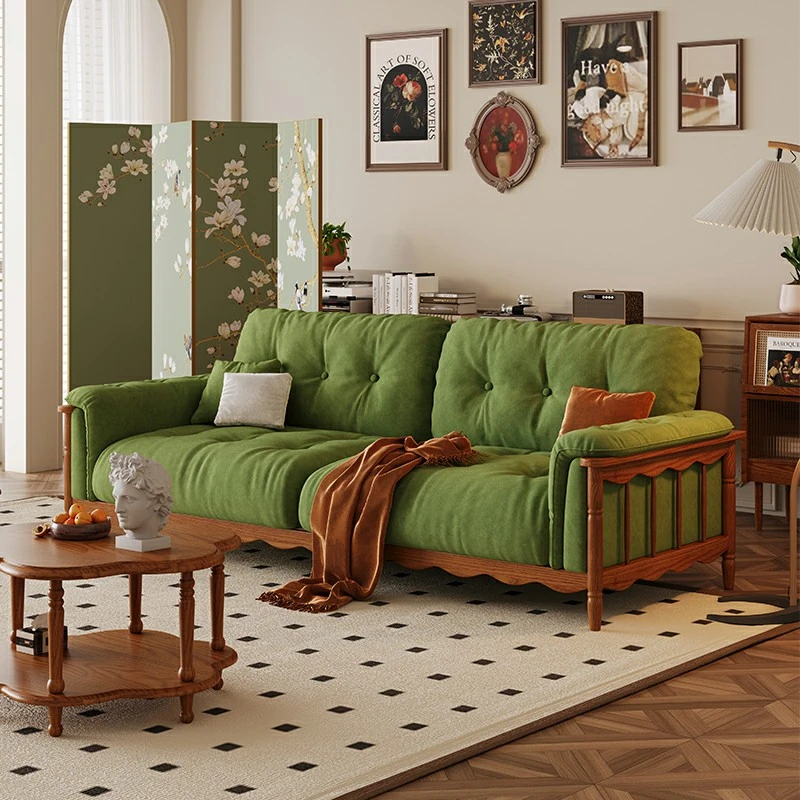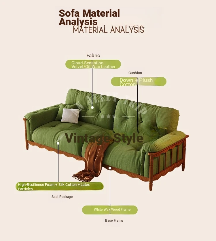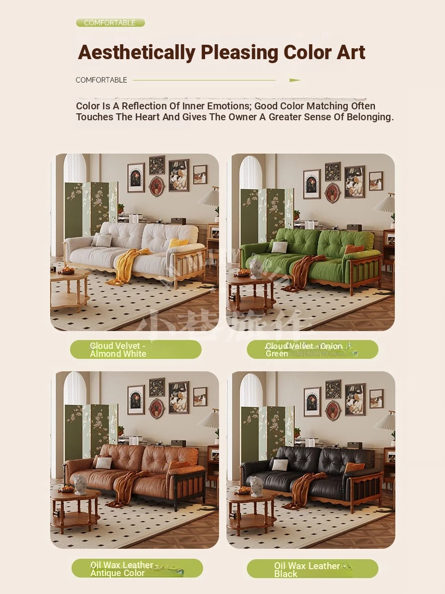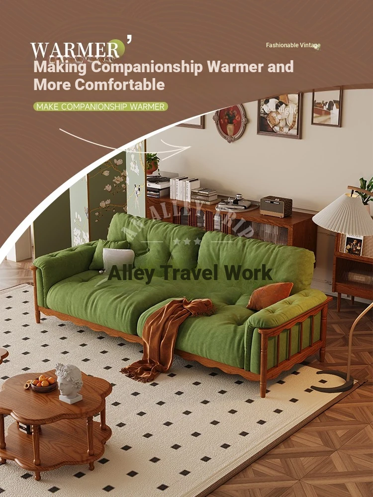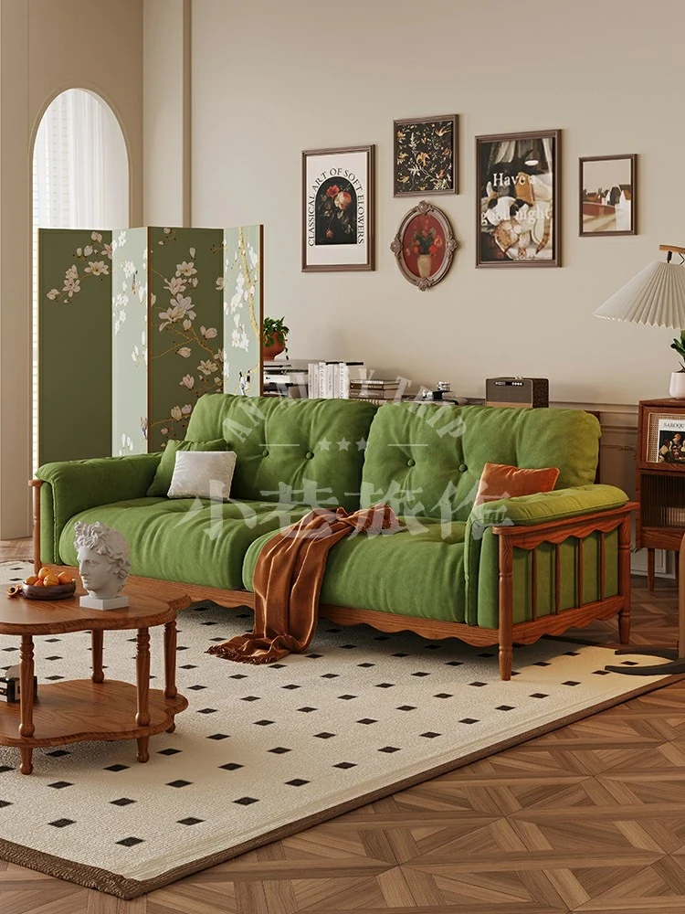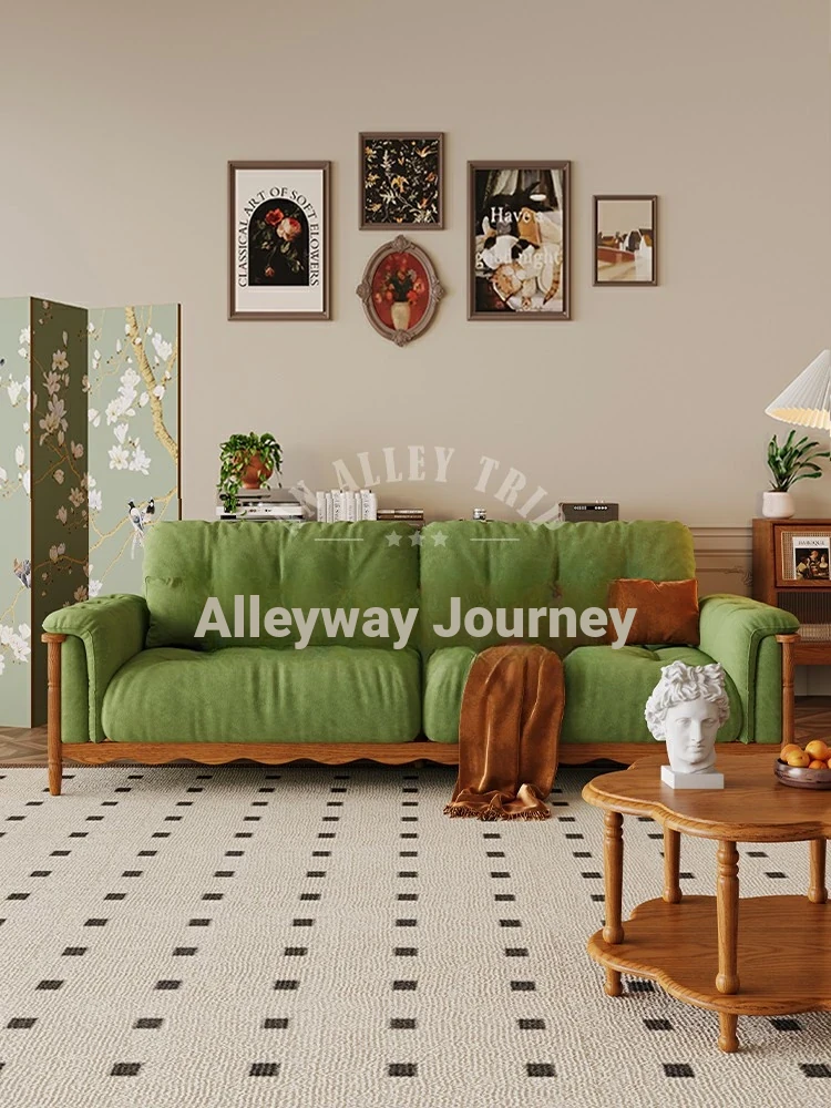 Chic French Vintage Solid Wood Cloud-Like Velvet Sofa - Straight-Line Waxed Leather for Living Room Comfort