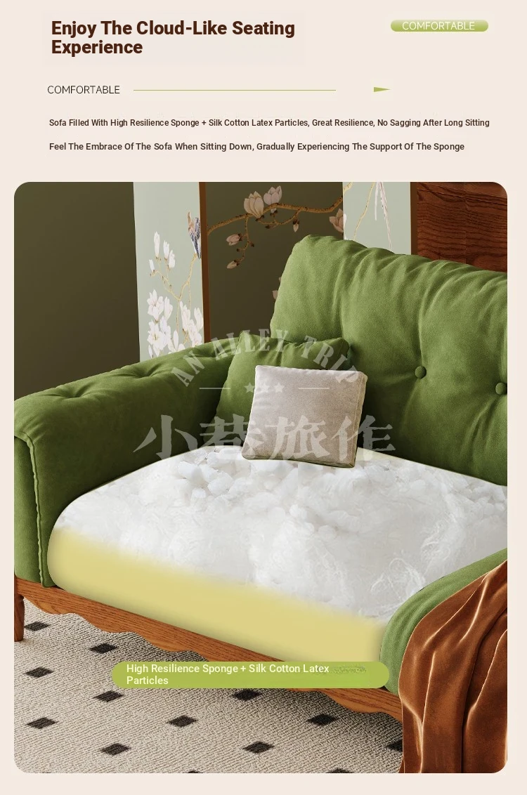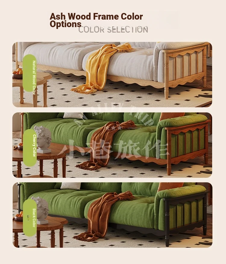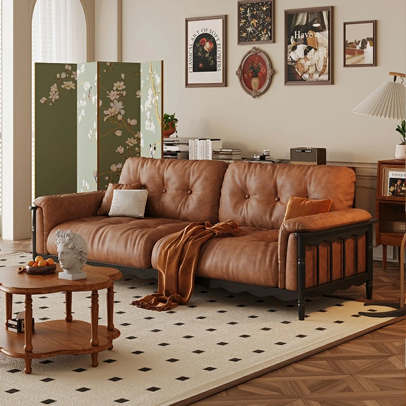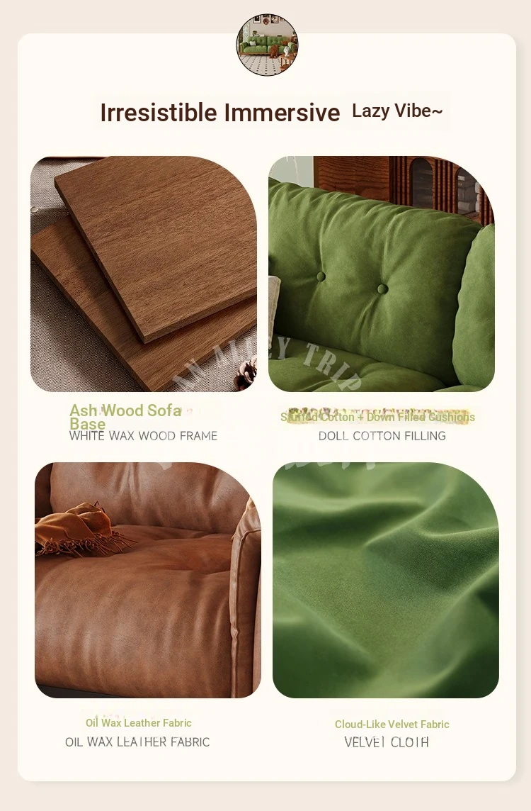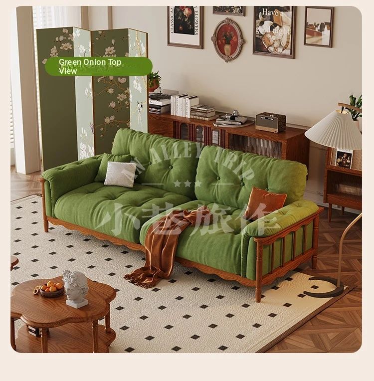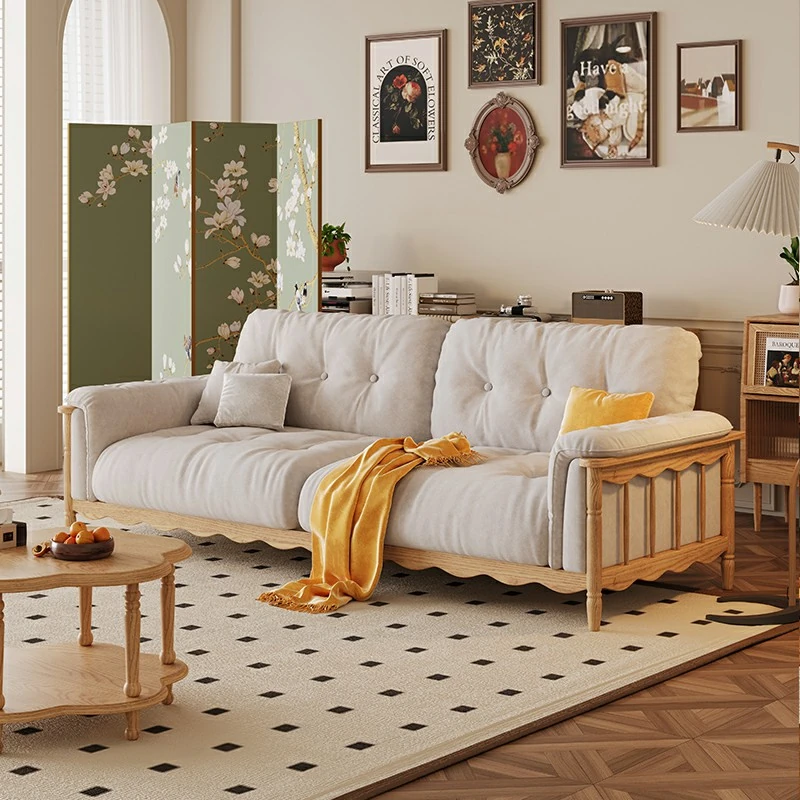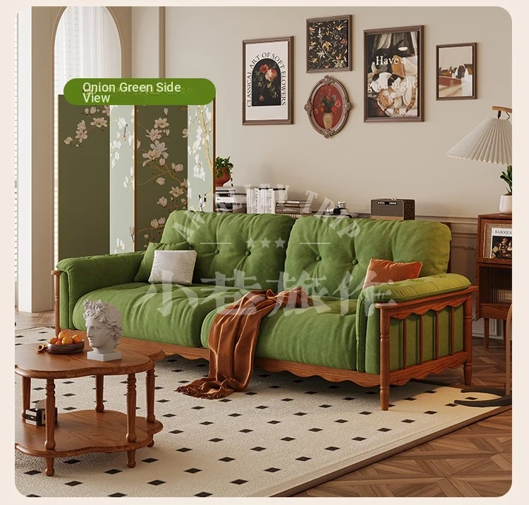 Chic French Vintage Solid Wood Cloud-Like Velvet Sofa - Straight-Line Waxed Leather for Living Room Comfort