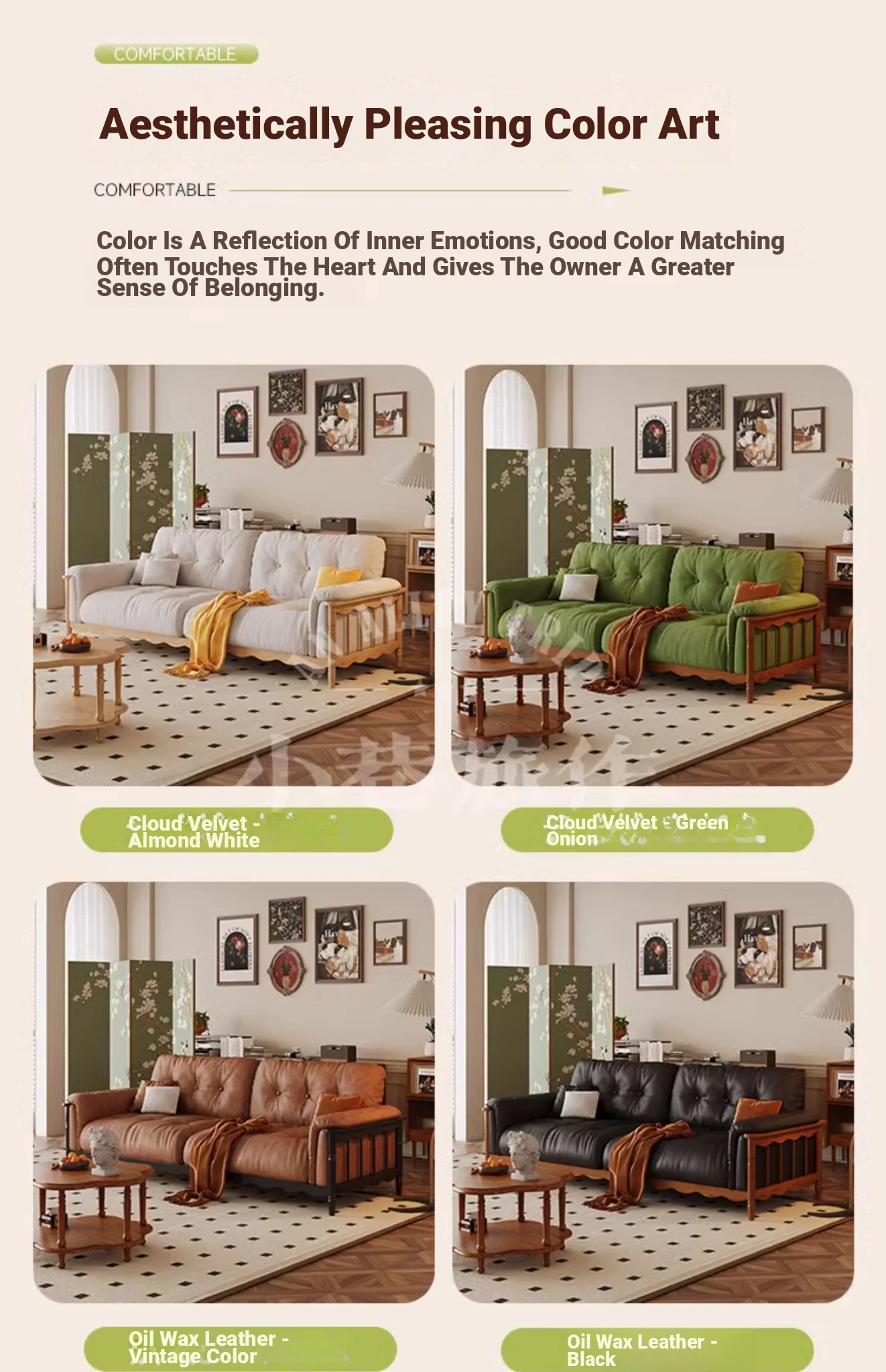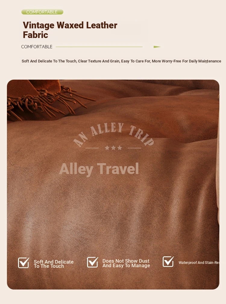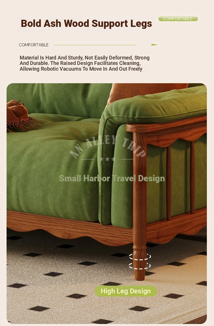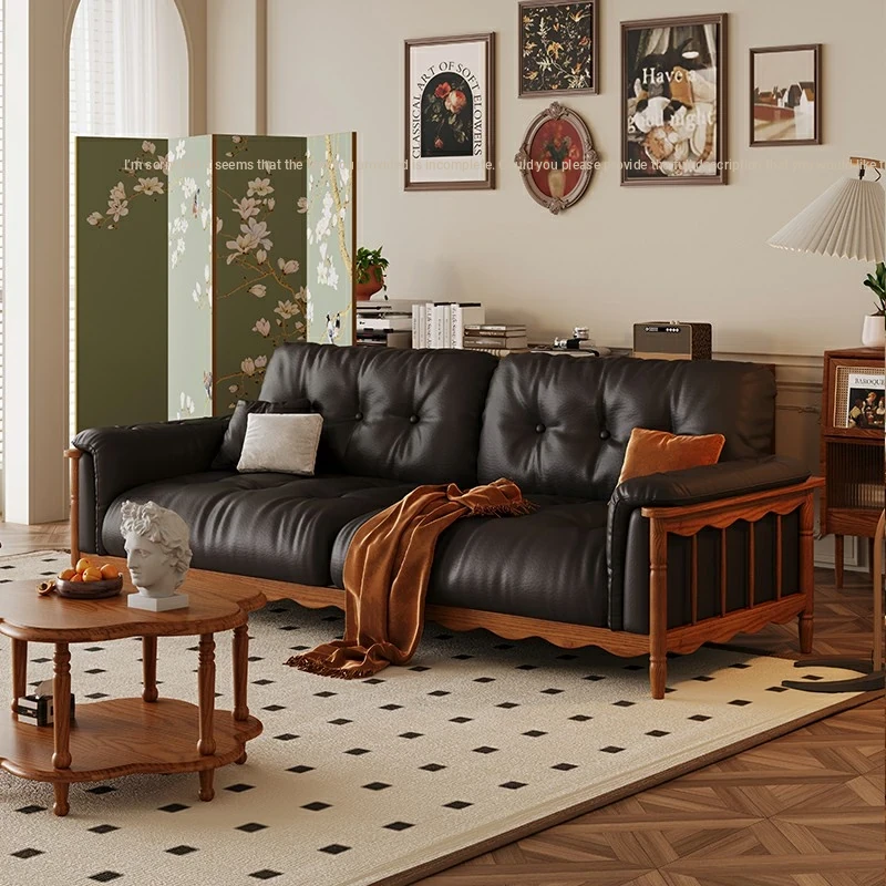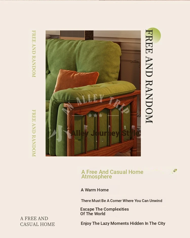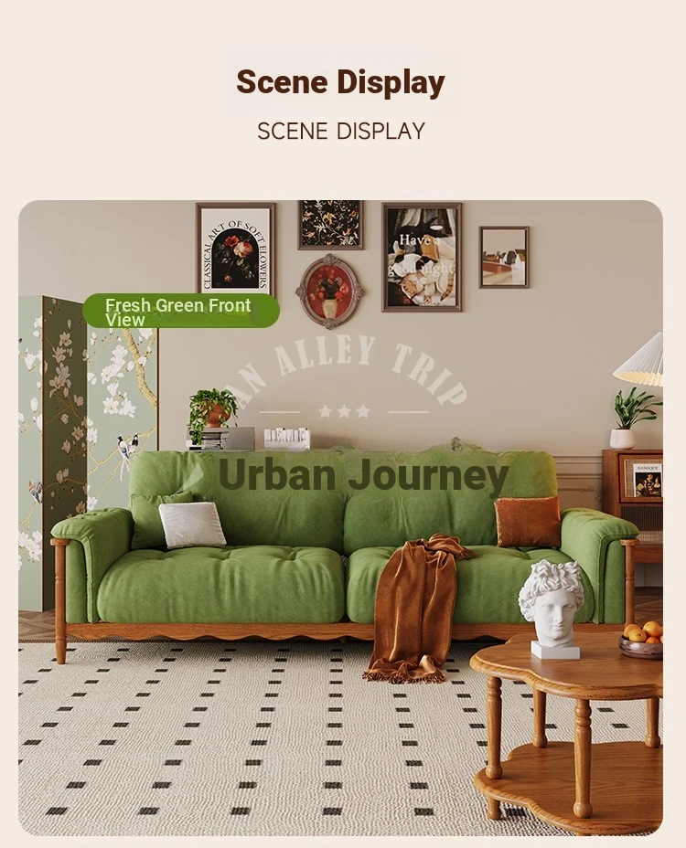 Chic French Vintage Solid Wood Cloud-Like Velvet Sofa - Straight-Line Waxed Leather for Living Room Comfort