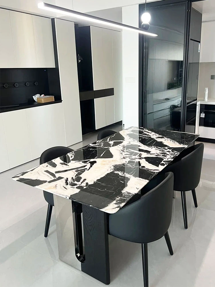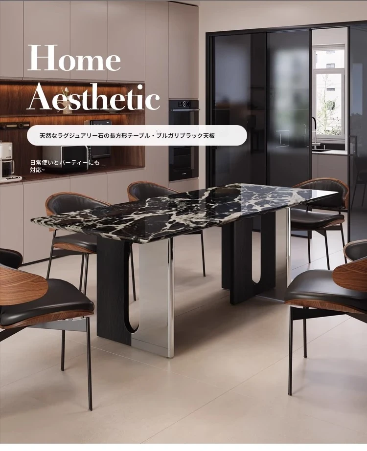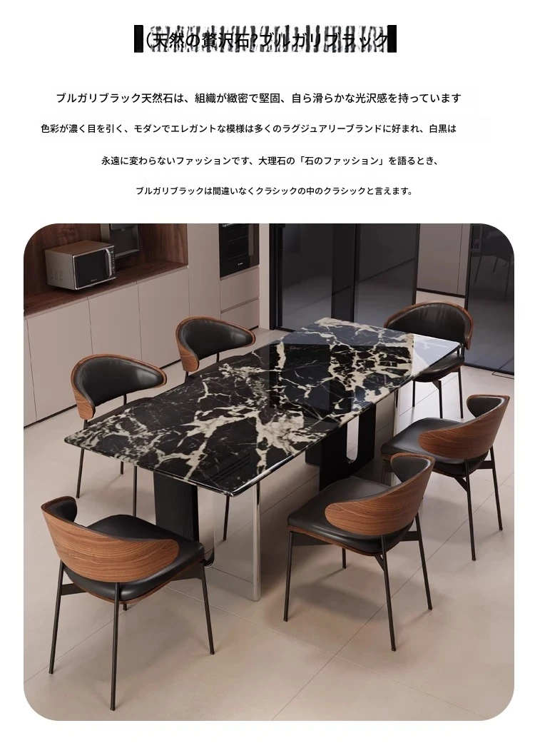 軽やかなラグジュアリー、ブルガリブラック輸入高級石製ダイニングテーブル。天然大理石の上質感が際立つ小型四角テーブル&チェアセット。あなたの食卓に洗練されたスタイルを。