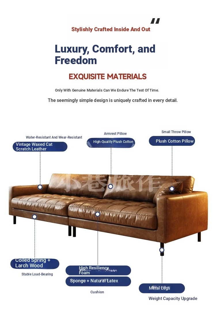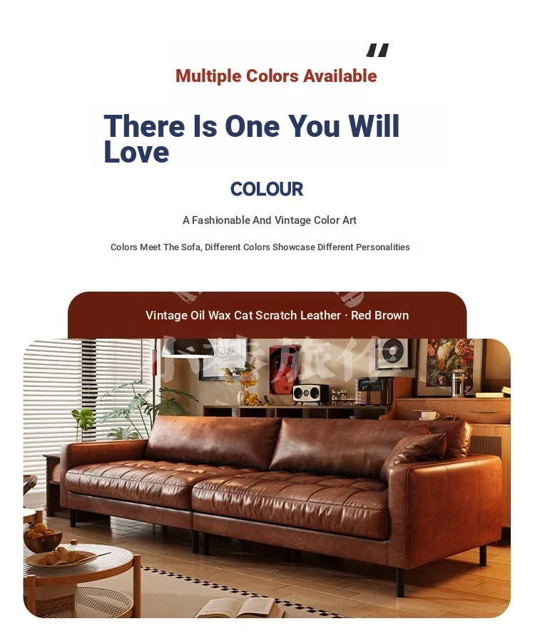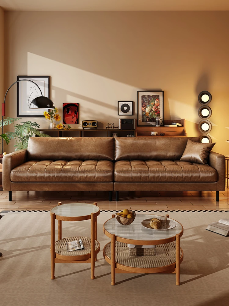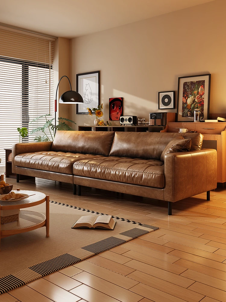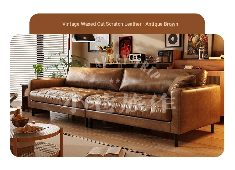 レトロオイルワックス加工のキャットグラブレザーソファ - 中古風の小型リビングルームに最適!アンティークブラウンのストレートソファで、狭いスペースでもスタイリッシュに。おしゃれなインテリアにぴったりです!