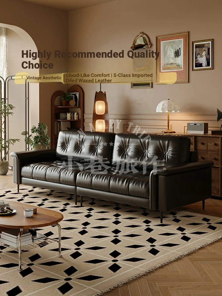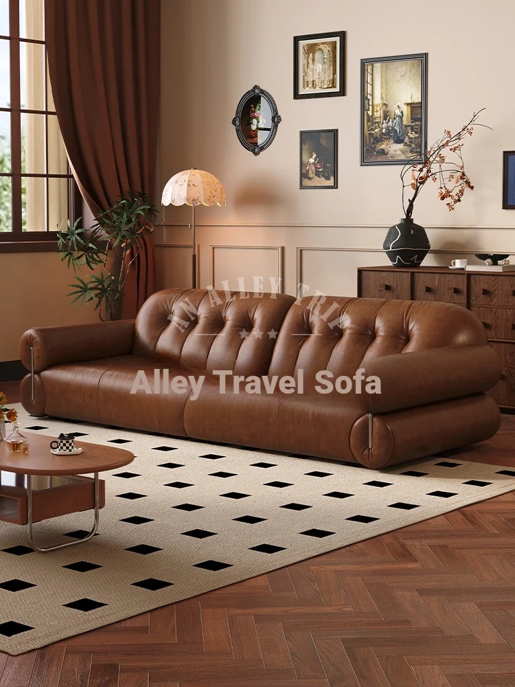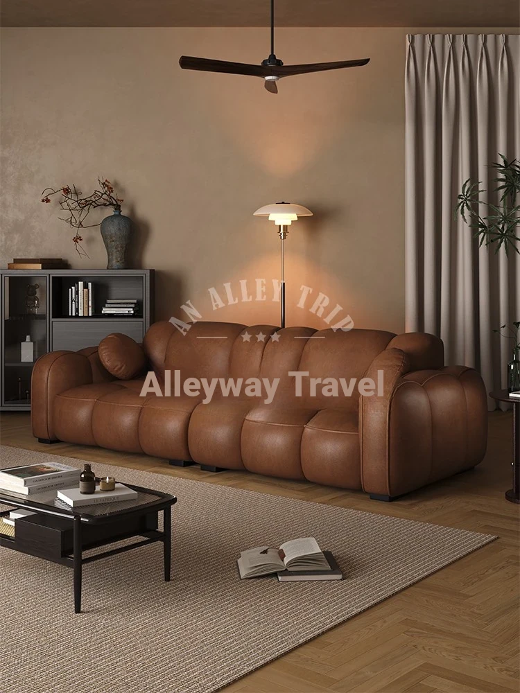Alley Travel | French Vintage Waxed Leather Black Sugar Cloud Sofa - Perfect for Small Living Rooms, 2025 New Arrival