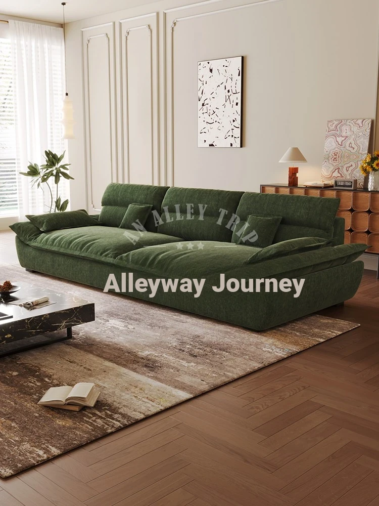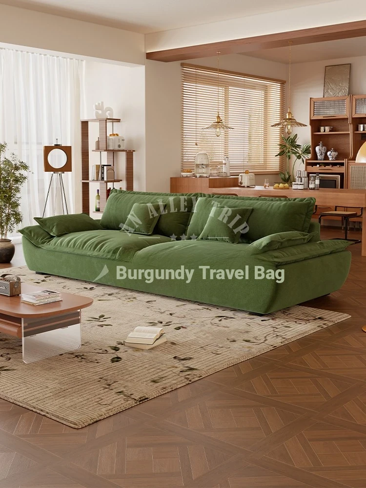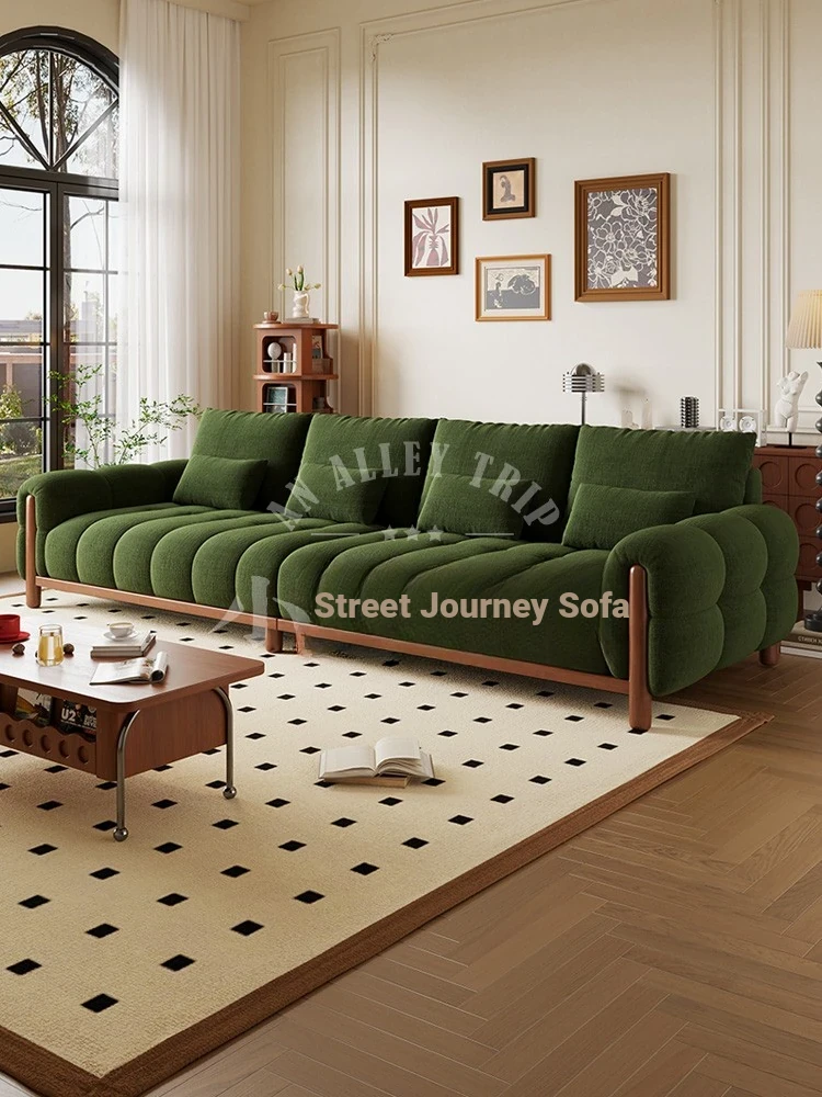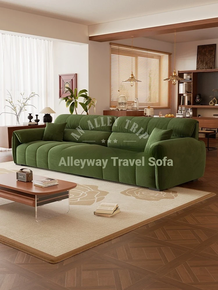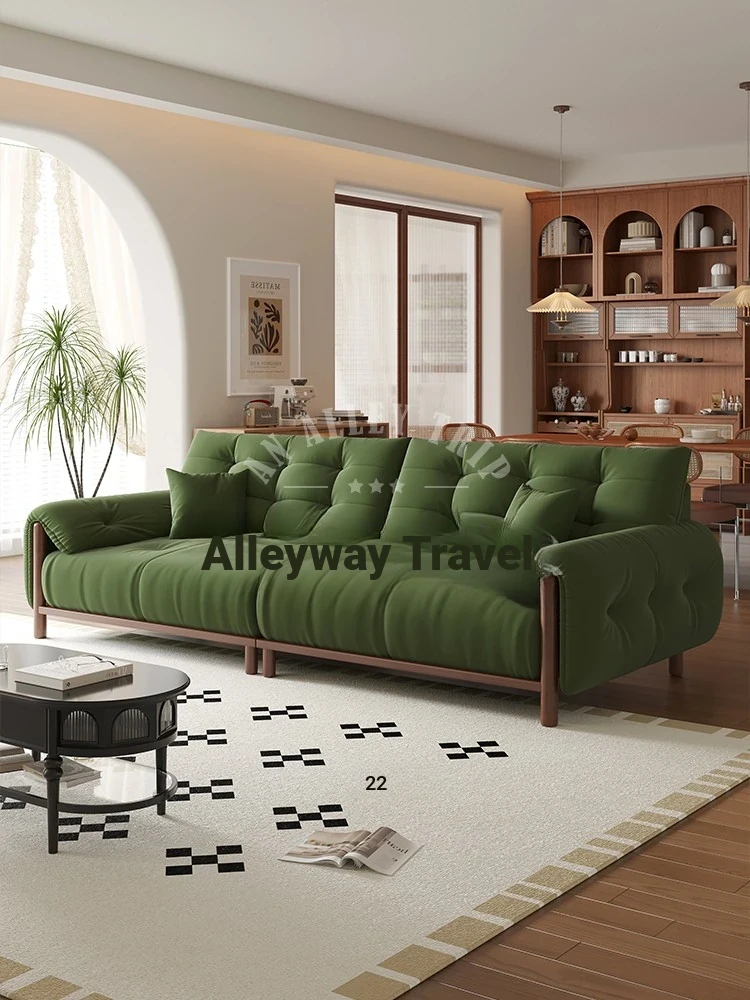 Chic French Vintage Solid Wood Cloud-Like Velvet Sofa - Straight-Line Waxed Leather for Living Room Comfort