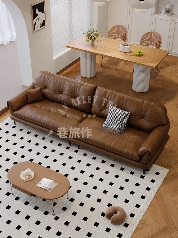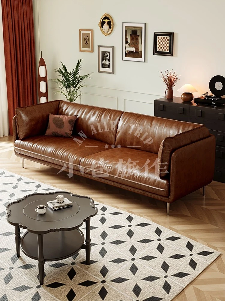 レトロノスタルジックなオイルワックス猫爪皮ソファ - 中古風フレンチスタイル、小型リビングに最適な直線デザイン!心地よい空間を演出し、どんなインテリアにもぴったりマッチします。